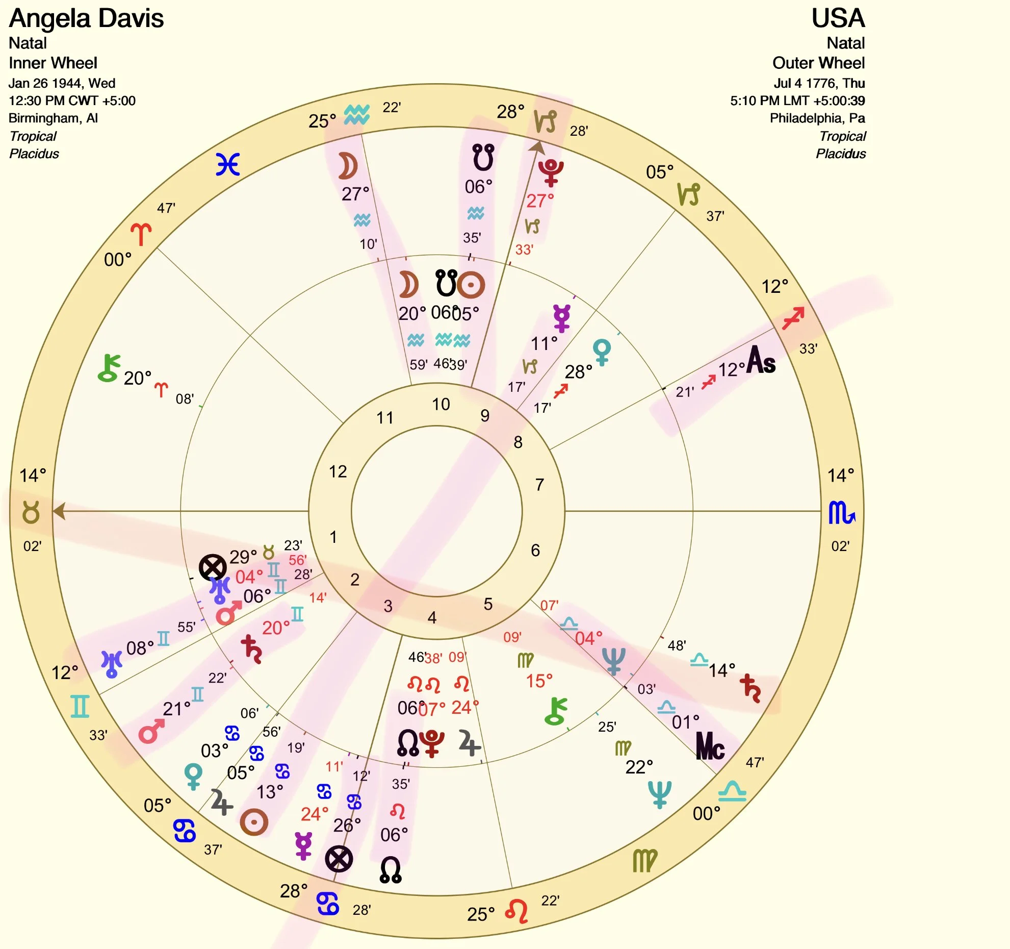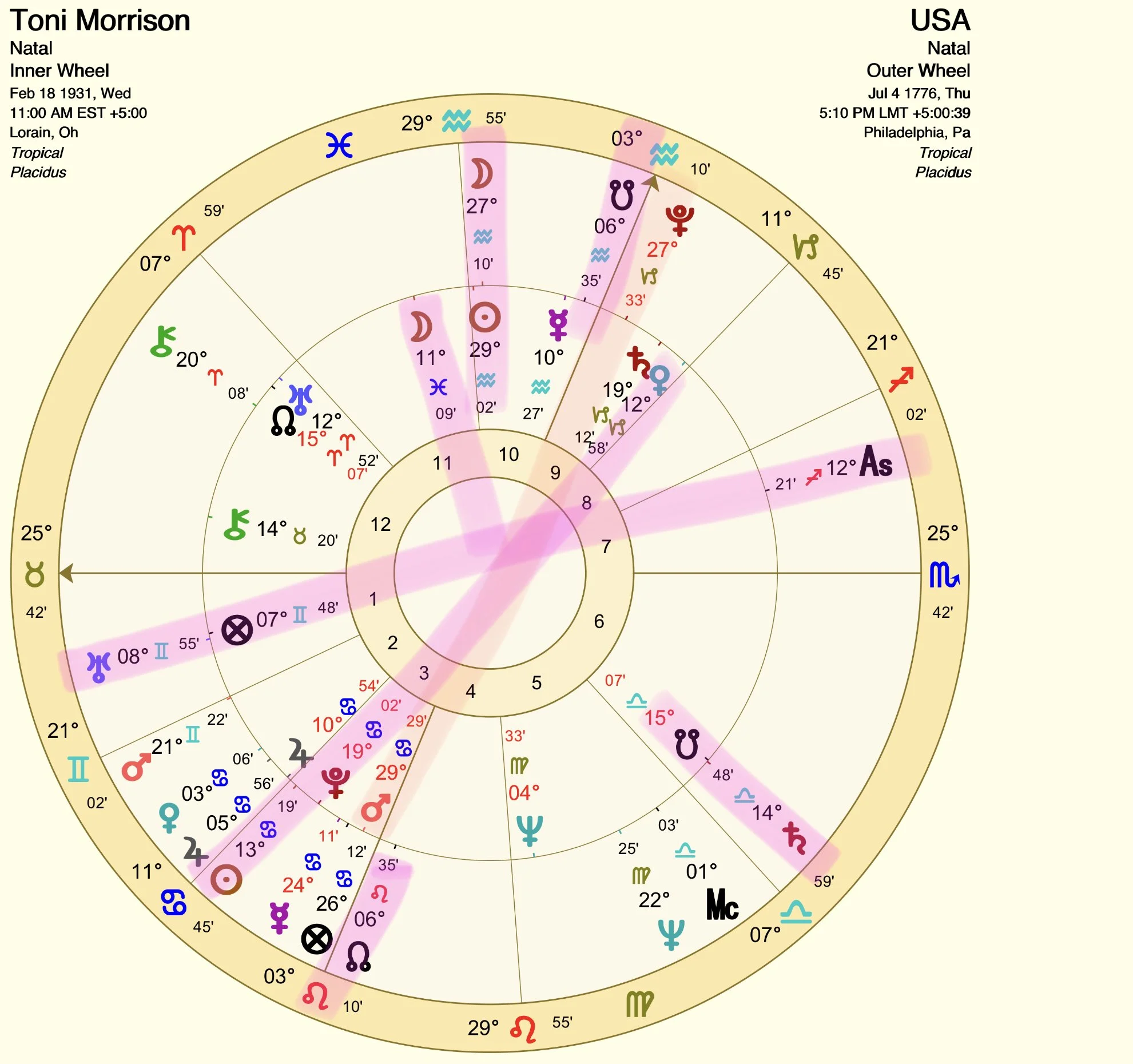 The truly iconic Angela Davis and Toni Morrison have natal charts that intersect with the natal chart of the USA in powerful ways. These alignments showcase their ability to speak directly to the American psyche, American experience, and especially the shadow of America. As citizens of this country, their words can directly hold the brokenness of our hearts, jerk our tears and most importantly inspire re-imagination. Their words and workings are the charms that carry the spells of an alternate way of relating to the propaganda and violence that we are experiencing in this country.